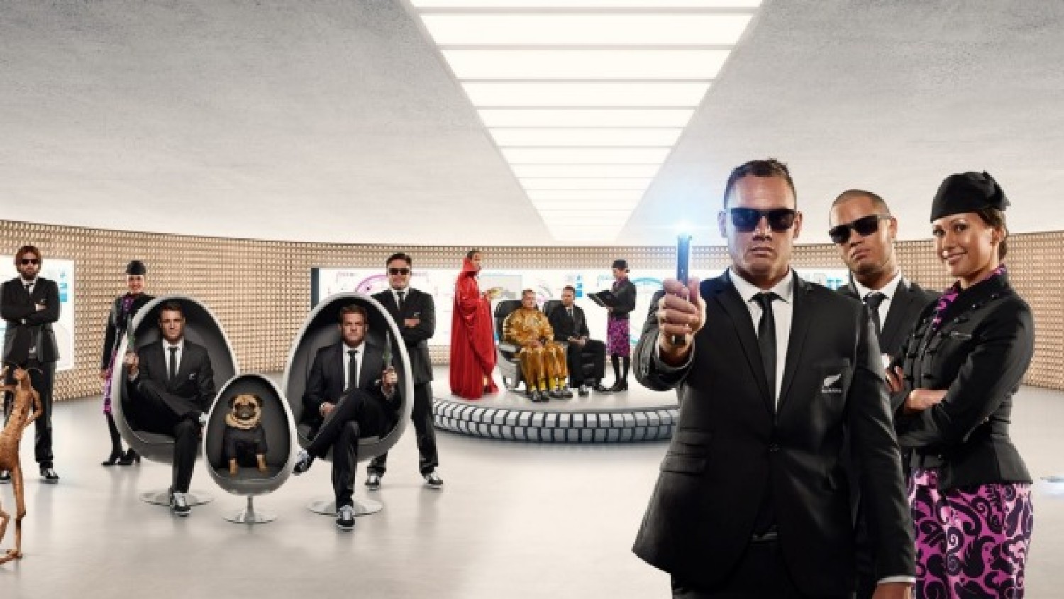 The connection between the All Blacks (the NZ Rugby Team) and Men In Black is a concept lost on most people living outside the Rugby world. Certainly, if you aren't familiar with the sport, viewers will be confused by the proliferation of featured middle aged men in place of the bikini-clad flight attendants we're used to seeing.