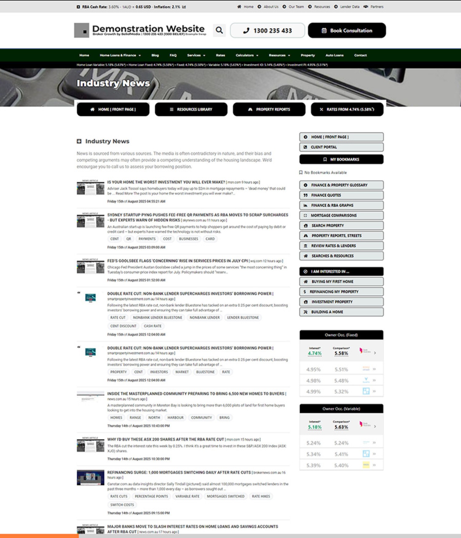 The above said, we only include one page of news headlines on our broker website which defaults to RBA related news... and the menu itself is buried and generally hard to find. Your website does have the capacity to render multiple pages of paginated news, but this is probably a bit much. The result of the single default news page is shown below, although a number of stylistic options apply so your experience will take on its own shape. Each news article headline passes through a redirector link that will retrieve various details before redirecting to the destination page.