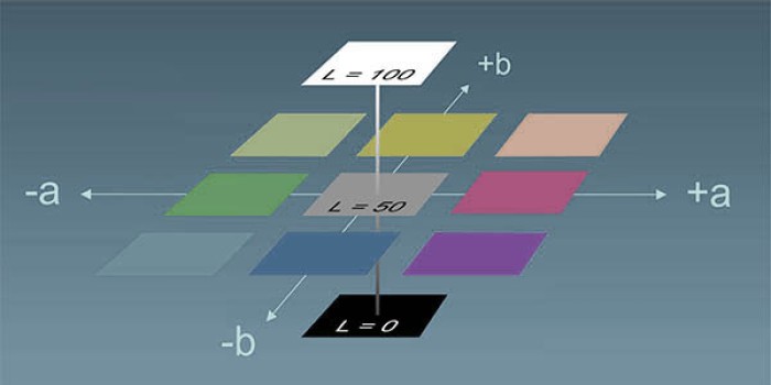 Image: The most commonly used system in practical application, aside from the CIE color triangle, is the nearly perception-true L*, a*, b* system that was developed by Judd and Hunter and standardized in 1976. In this system, the L* value indicates the position on the light-dark axis, the a* value indicates the position on the red/green axis, and the b* value indicates the position on the blue/yellow axis).The L*, a*, b* coordinates are correlated directly to the standard color values, X, Y, and Z. Source: Zeiss