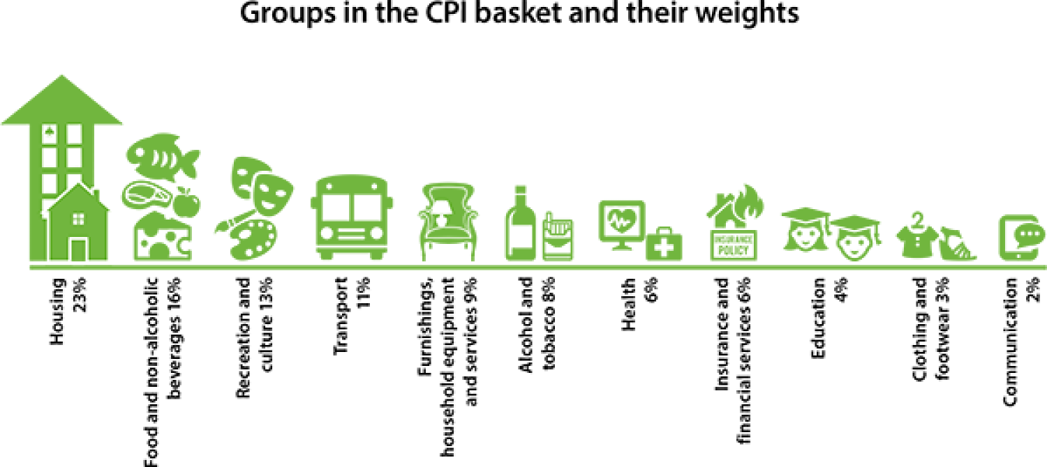Pictured: Selected groups in the CPI basket and their weight when compared against each other. In deciding which goods and services to include in the CPI basket and what their weights should be, the ABS uses information about how much – and on what – households in Australia spend their income. If households spend more of their income on one item, that item will have a larger weight in the CPI. For example, the ABS included smart phones in the CPI to reflect consumers taking advantage of advances in technology. Data on household spending across all items is only available approximately every five years or so.