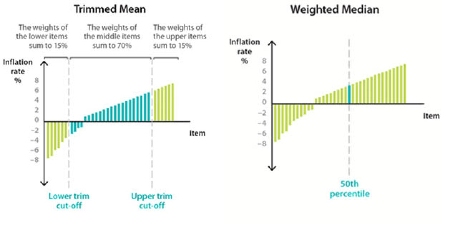 Trimmed mean is the average rate of inflation after ‘trimming’ away the items with the largest price changes (positive or negative). It is the weighted average of the middle 70 per cent of items. Weighted median is the inflation rate of the item at the middle of the price changes in the CPI basket (the 50th percentile by weight).