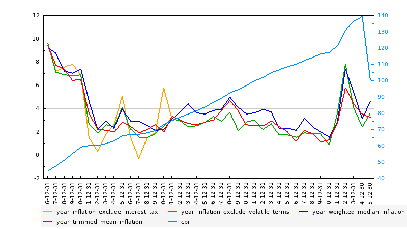 Shortcode used was [inflation points="40" fields="cpi, year_inflation_exclude_interest_tax, year_inflation_exclude_volatile_terms, year_weighted_median_inflation, year_trimmed_mean_inflation"]