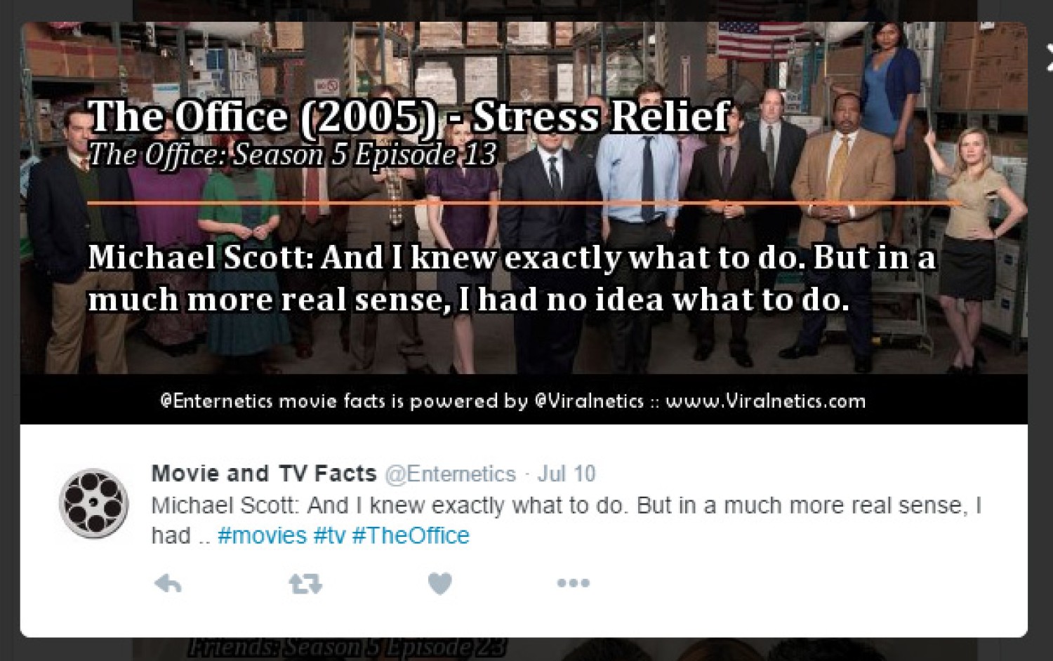 The image and text sent to Twitter is completely automated. Reading from a database of movie quotes and facts, we determine an appropriate background image and then overlay whatever text is required before it's sent.