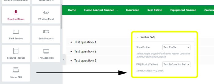As with most of our website tools we try and build an Elementor block to support their inclusion on a page. The FAQ block, labelled 'FAQ Yabber' can be dragged anywhere onto a page to return the FAQ profile selected in the Elementor menu.