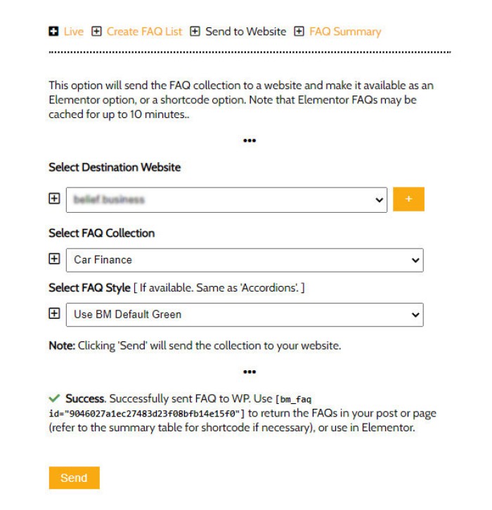 Yabber is a multi-website system, so we don't send data to your website unless actioned by you. You simply select the FAQ Profile, select the destination website, optional style, and send. The module is immediately made available within Elementor or optionally via shortcode.