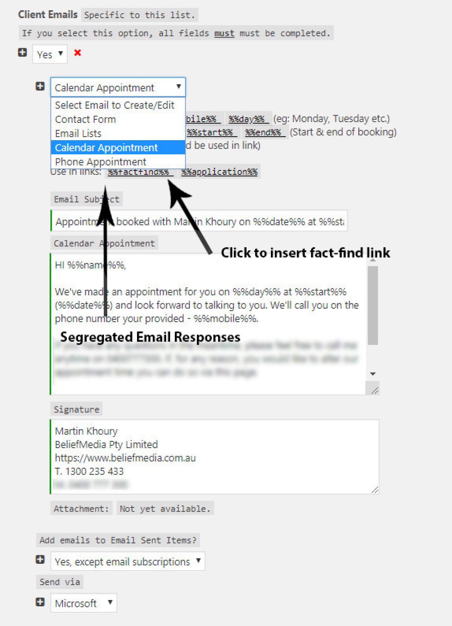 Some brokers will redirect to a form asking for personal borrowing details after a subscription or booking (this is what most incorrectly call "qualification"... and some will recklessly ask the questions on a booking page before a user has committed in some respect). The unnecessary so-called qualification step is one we mitigate by providing a link via the initial email to either a fact-finding questionnaire, more comprehensive compliance-based questions, or even an online application (all hosted on your website, of course. A form should never be hosted anywhere other than under your own secure and branded domain name). Keep in mind that our initial email is different for different audiences; your lead will either be a subscriber, make a booking, or provide a phone number for a callback - we absolutely cannot treat all subscribers or inquires in the same way. For the First Contact email we have an option to include various placeholders into our email via the click of a link that places the relevant links into our email body. Then, after a user chooses to completes the optional compliance-based questions (usually an enhanced fact-find) we'll qualify you further by sending them a PDF report based on their responses to our questions.