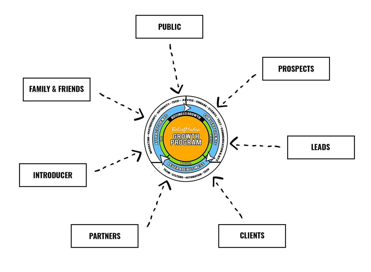 BeliefMedia's Gravity framework is simply the sources of leads and potential traffic to your business. In reality there are numerous paths that a consumer might take to reach you; we've narrowed it down to just the primary groups. Each group of consumers is treated vastly different, and each is managed in different ways. Each source of incoming business has a varying heat index (or cost factor), and each represents a varying degree of 'difficulty' in order to convert. For example, the most challenging group to establish a dialogue is the 'public' in almost all cases. There's (usually) a clear cost associated with their acquisition and there's a challenge in order to convert them into business... and then there's another more difficult challenge to turn them into brand advocates. On the other end of the scale is 'family and friends'. While many are protective of their own family (and often choose to separate church and state) they are usually the easiest to convert and far easier to develop as referrers than any other group.