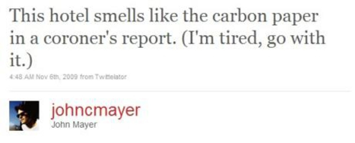 "This hotel smells like the carbon paper in a coroner's report. (I'm tired, go with it.)" Mayer said.