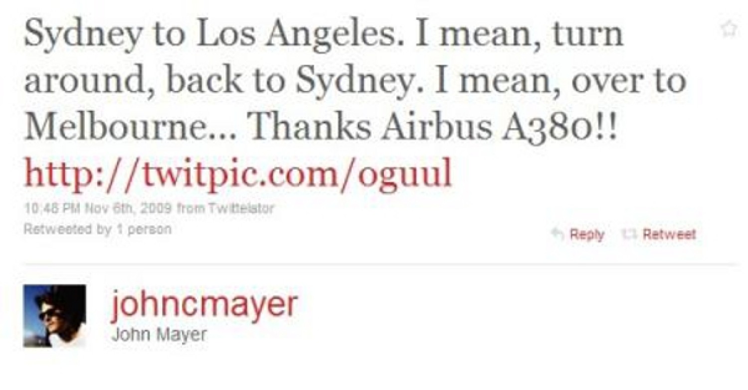 John Mayer tweeted his adverse experience onboard a Qantas A380 flight yesterday and demonstrated the real time damage a single tweet