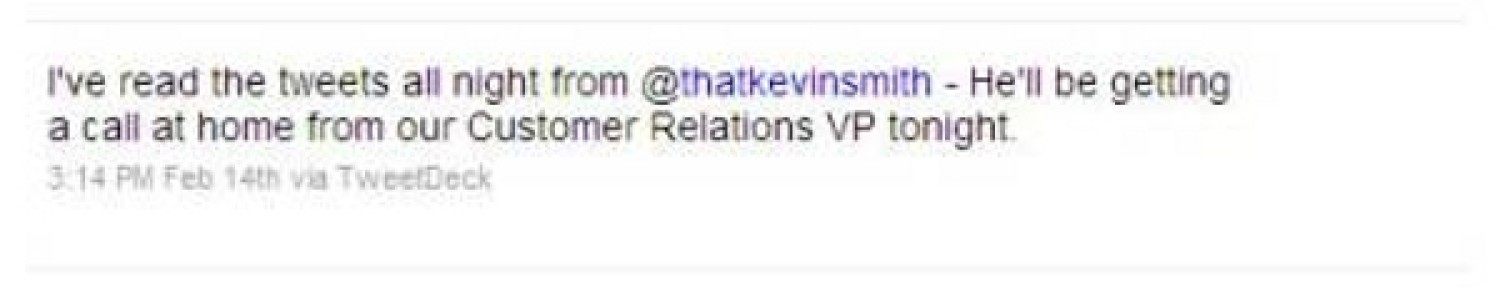 of over 1.6 million people. The damage (and good) Kevin can potentially cause a brand is quite extraordinary - not only because so many people listen to him, but because he has worked so hard at creating a personal bond with his followers that they may also share his frustration on a more personal level (through a social phenomena known as emotional transference). When Smith tweeted his unfavourable experience, 1.6 million people heard him.