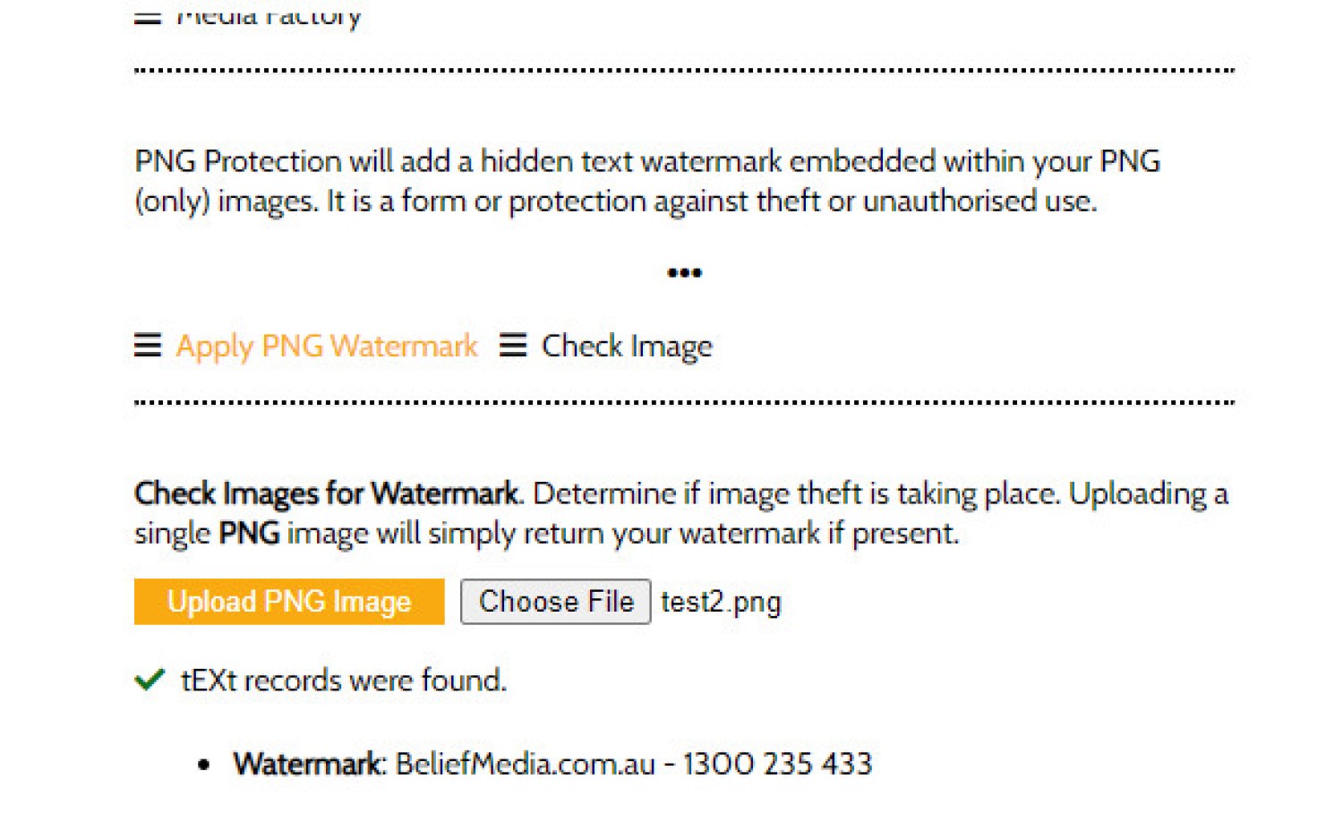 To check an image manually to determine if it carries your watermark, select the 'Check Image' tab, upload a single image, and all text data will be returned.