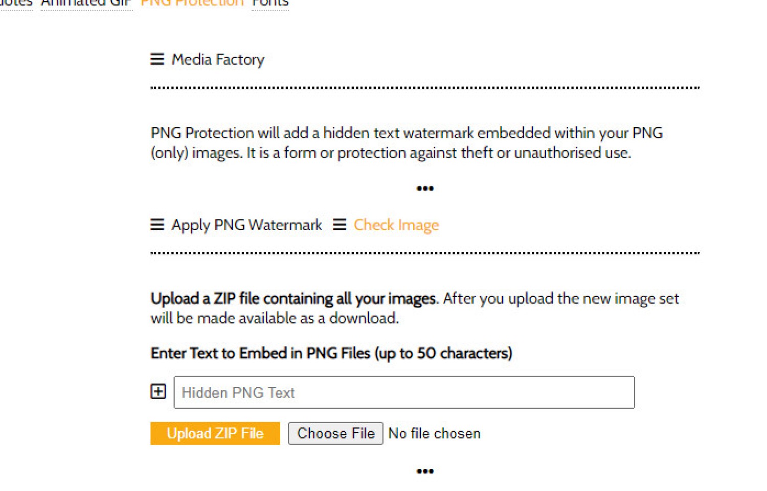 If you're interested in branding your own library of images you may do so from within Yabber via the Media Factory module. To use the feature, select 'PNG Protection' from the 'Tools' menu and upload a ZIP file of all those PNG images you would like to have stamped with your hidden and internal watermark. Click 'Upload' and another ZIP file will be returned to you with a set of branded images.