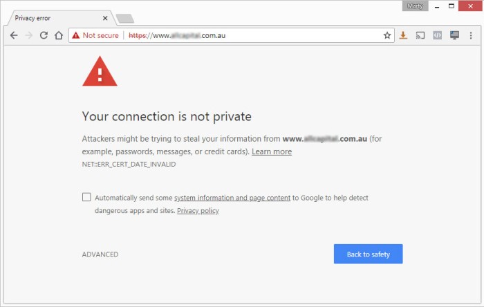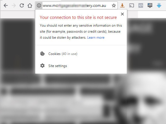 If you select "Advanced" there's an option to proceed to the website, but it's marked as "unsafe". This is what 83% of mortgage brokers are potentially serving to their online visitors.