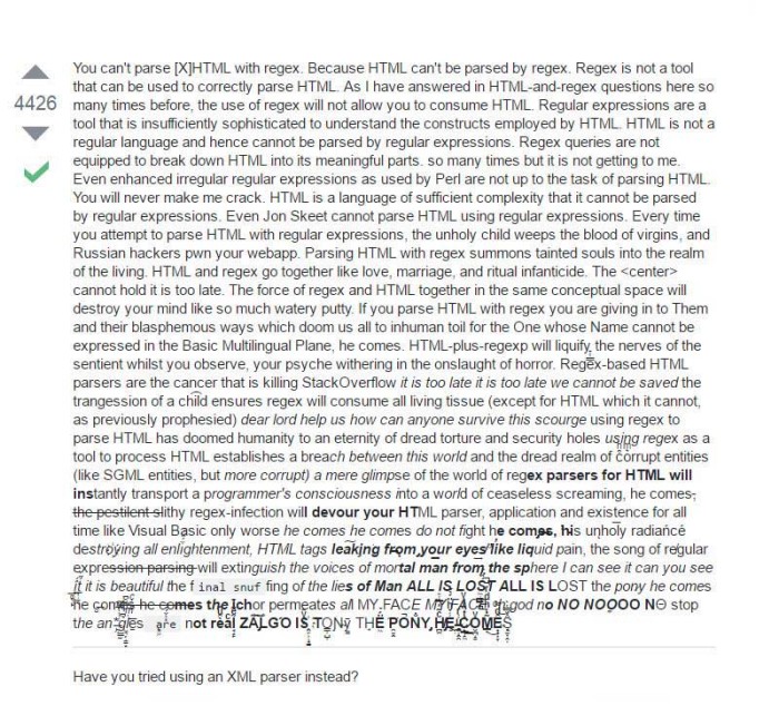 class is almost always a better option. In my case, the regex was just easy. Obviously, if the format for listing the functions on either page changes then the regex will have to be updated.In terms of using regular expressions to parse HTML, the following post from Stackoverflow