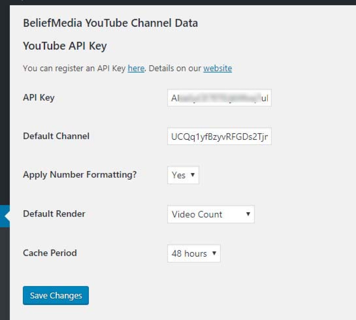 Upload and activate via your plugins menu. Select Tools -> BeliefMedia YouTube Channel Data to define the defaults (and API key).