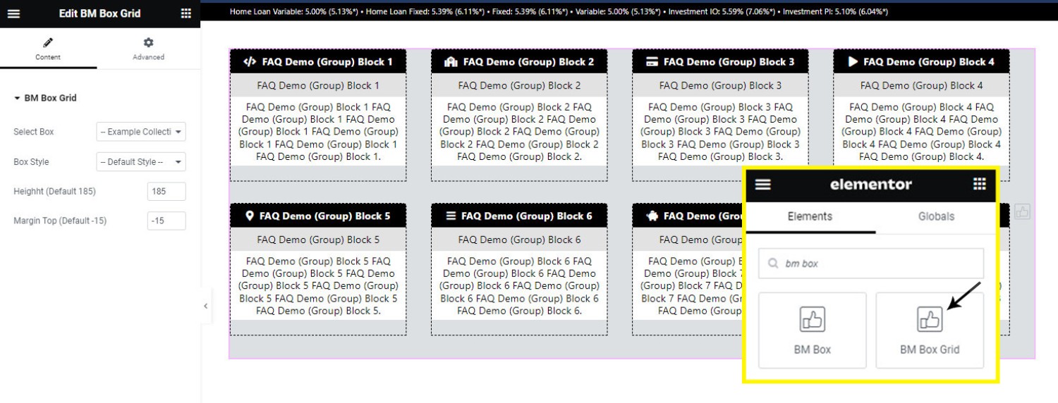 In a previous FAQ we introduced to the the 'BM Box'. The 'BM Box' is a navigation and panel element that provides information in a format that was deliberately designed to emulate the general presentation of the Lender Widgets on your website. The BM Box is created in Yabber or Elementor, and a number of attributes apply that'll alter how each container is returned. This FAQ will not look at BM Box creation, so you should consult the article titled "How to Create and Manage Website BM Boxes" for guidance.
