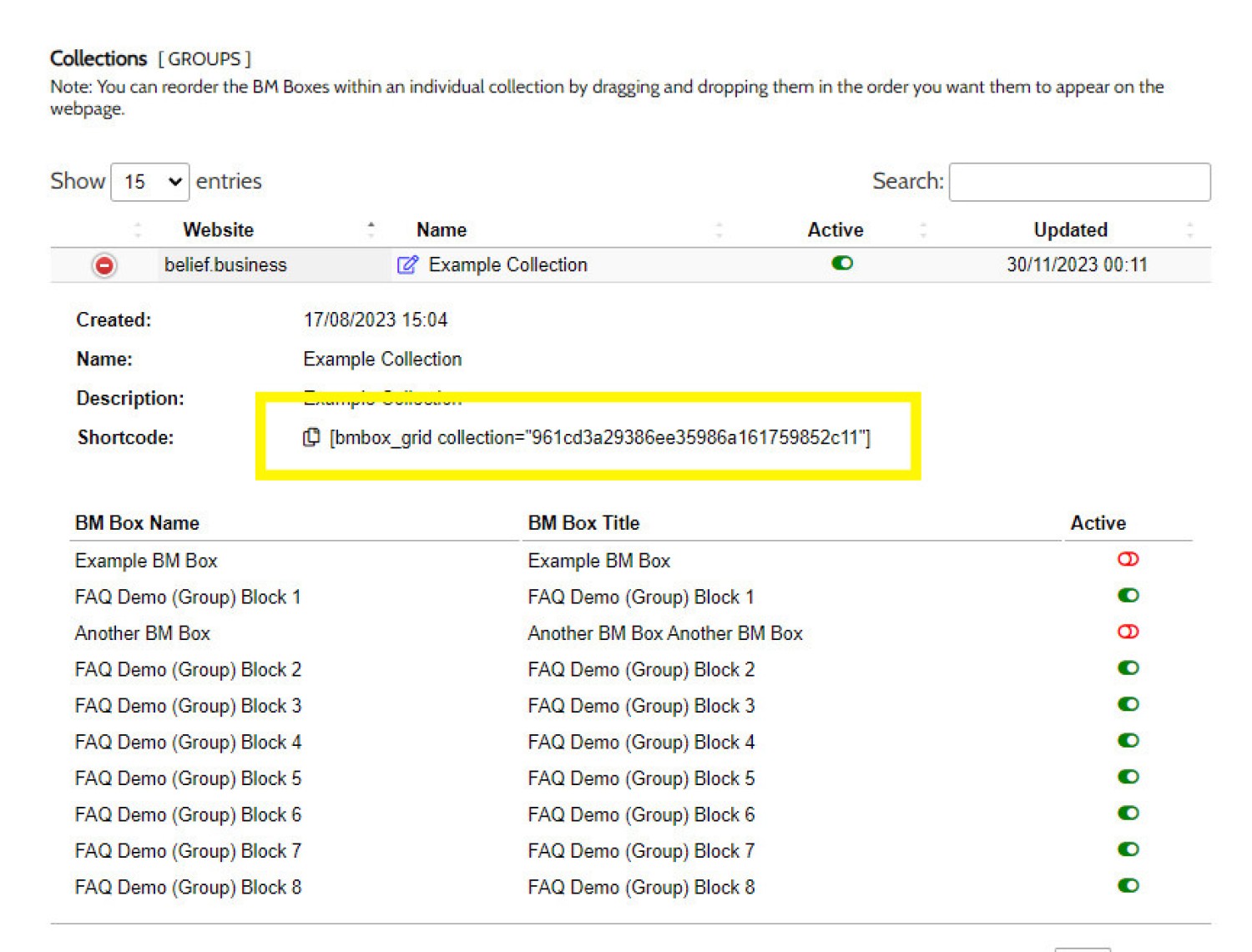 The shortcode required to return a BM Box is found within the 'Review' panel (pictured), or on later frameworks, from the BM Shortcode option attached to the WP WYSIWYG Editor. Copy this shortcode in the location you would like your Grid to be shown, and 'Save'. The format of the shortcode will be similar to the following: [bmbox_grid collection="group-collection-id"].