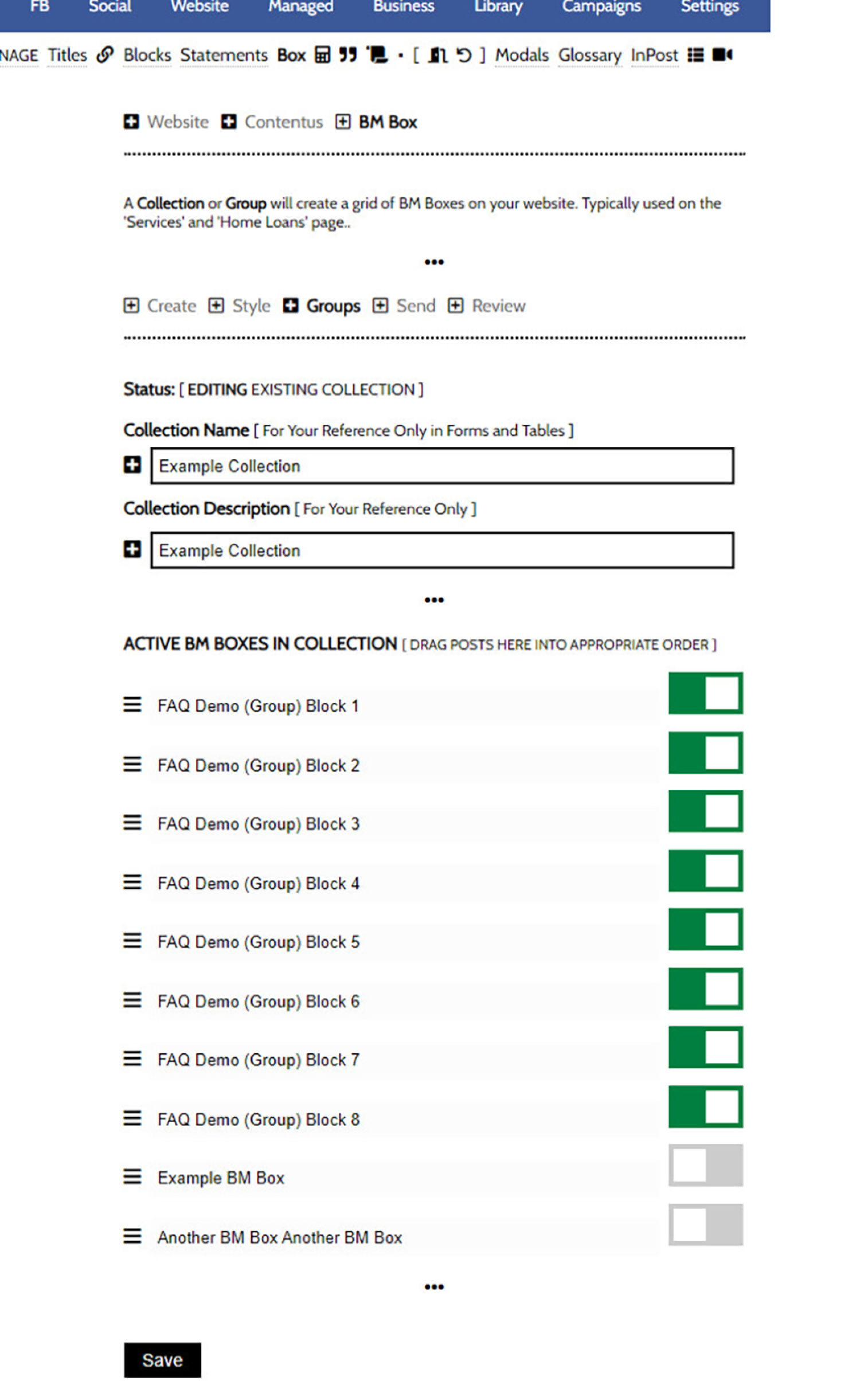 We'll group our individual Boxes via the 'Groups' panel. Drag and drop each Box in your collection into the order they'll be shown on your page, and selectively toggle them on of off to include them in your collection. Once done, select 'Save'.