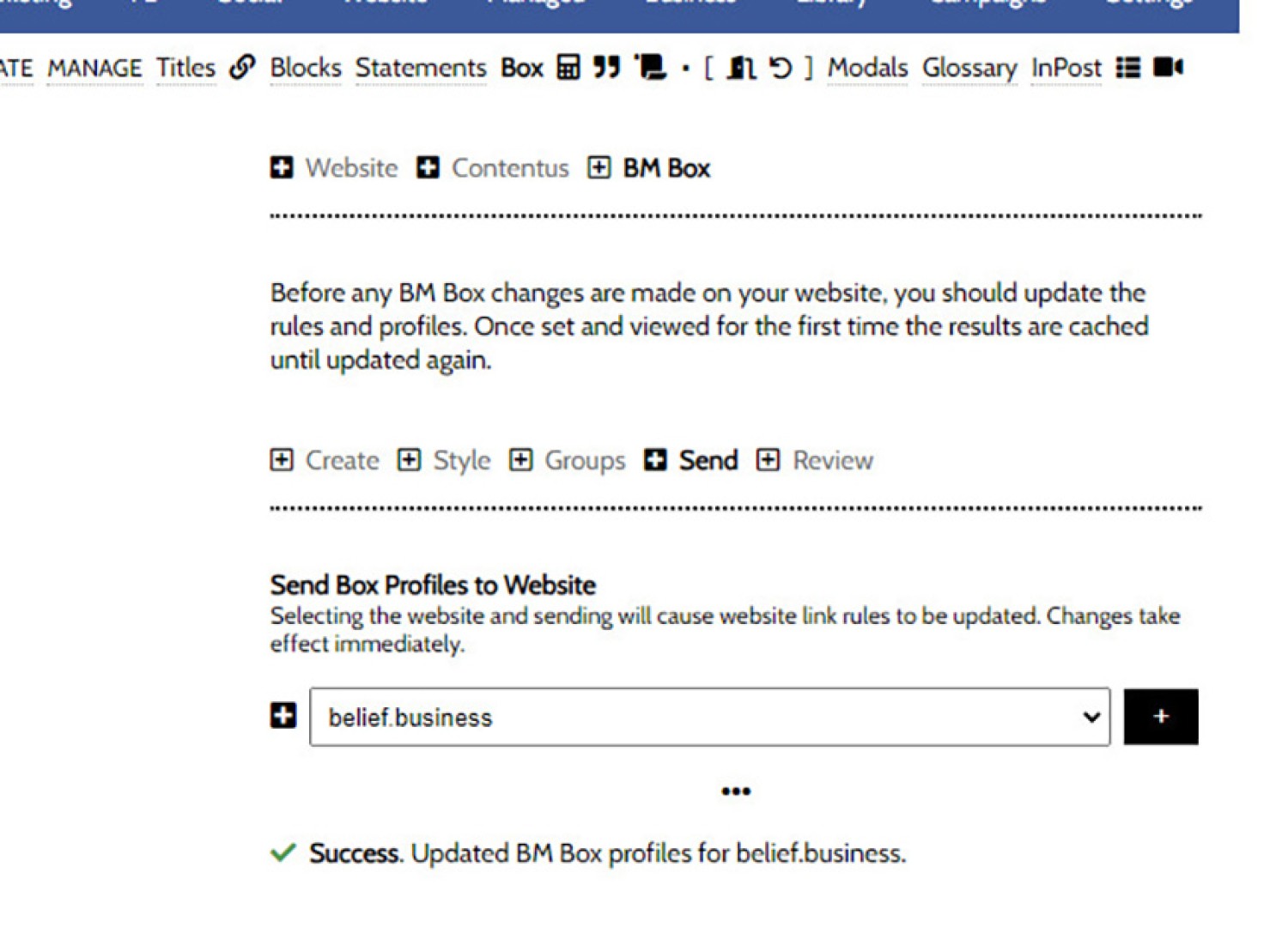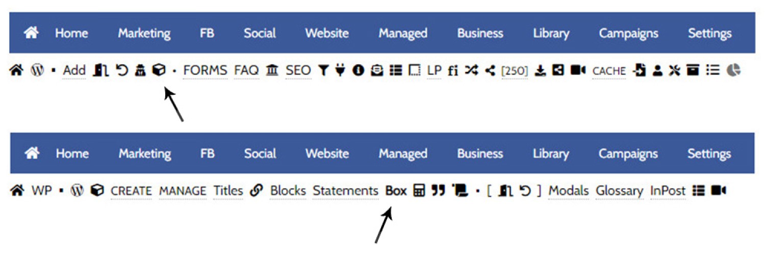 Pictured: You will find the BM Box module by first following the 'Contentus' icon in the the 'Website' module. You should then select the 'Box' submenu item.