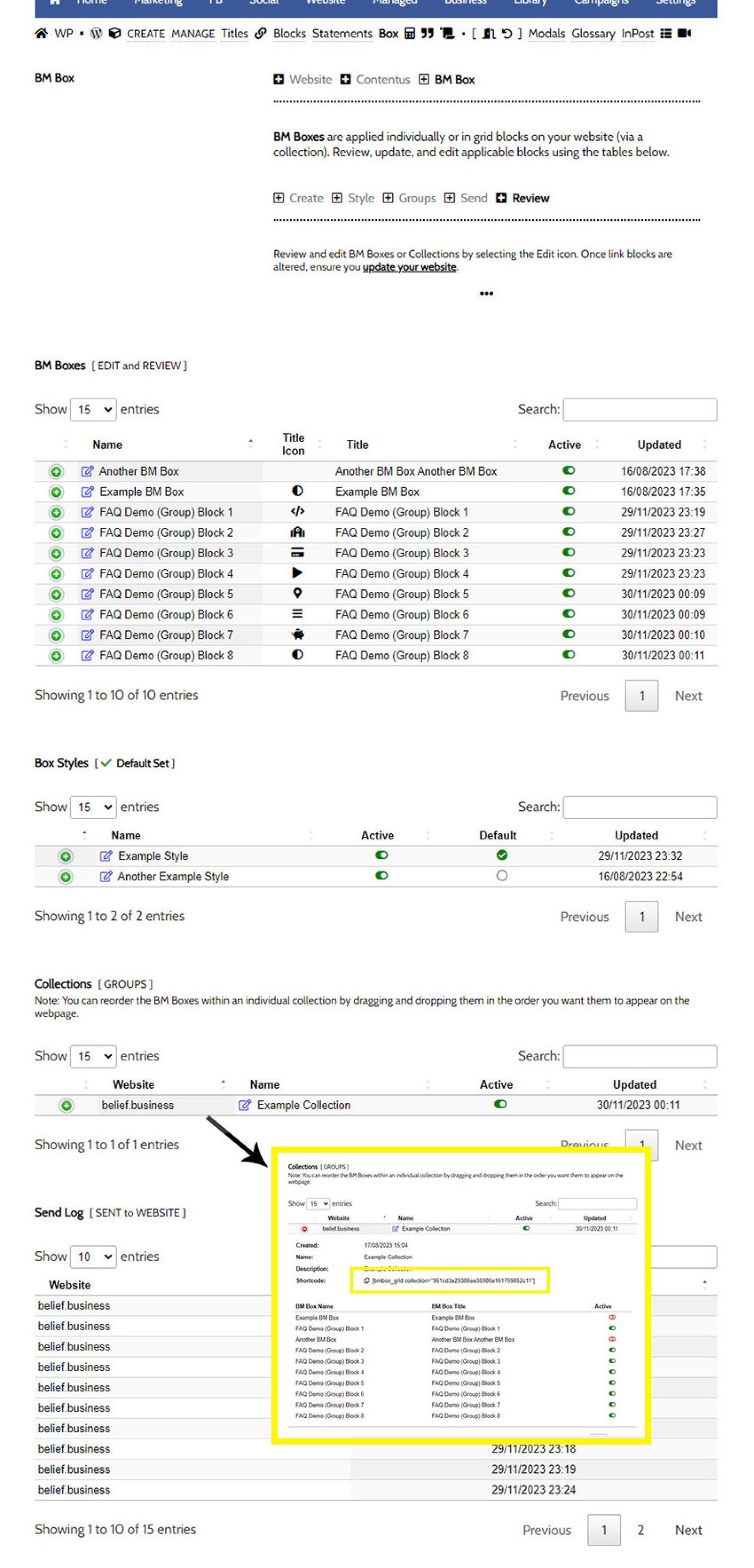 Pictured: The shortcode required to return a BM Box is found within the 'Review' panel (pictured), or on later frameworks, from the BM Shortcode option attached to the WP WYSIWYG Editor. Copy this shortcode in the location you would like your Grid to be shown, and 'Save'. The format of the shortcode will be similar to the following: [bmbox_grid collection="group-collection-id"].