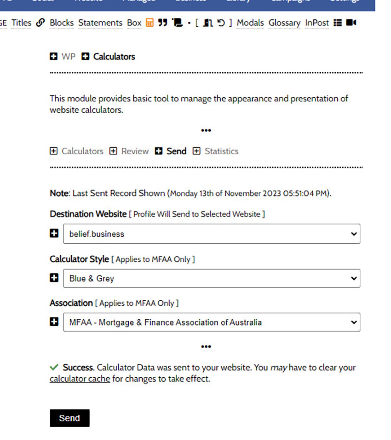 When we're happy with the text options we've defined we should update our website. Select the 'Send' panel, select your website, define other options, and send. This 'Send' action will also define our parent industry body (for the purpose of calculator branding).