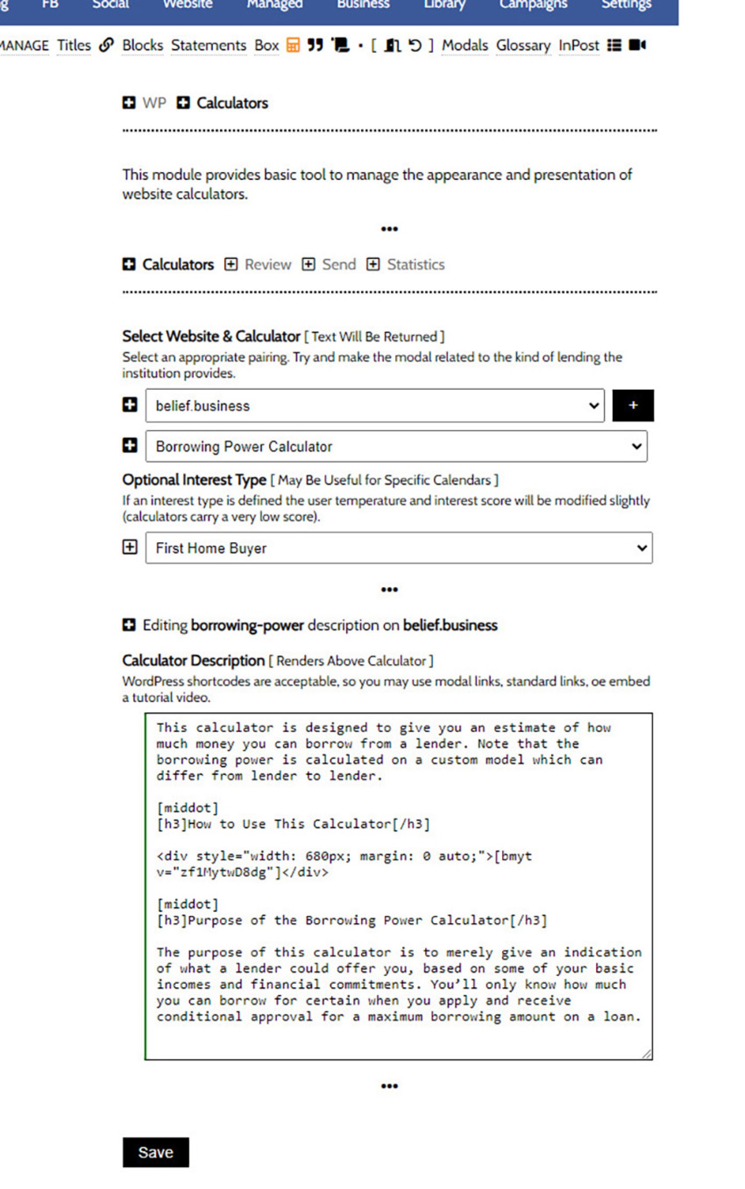 Pictured: We'll update the text for the 'Borrowing Power Calculator'. Select your website and calculator, define your interest and submit. A panel is returned with a text option. If no text has been provided, default text is returned that you may modify. Populate the text and save.