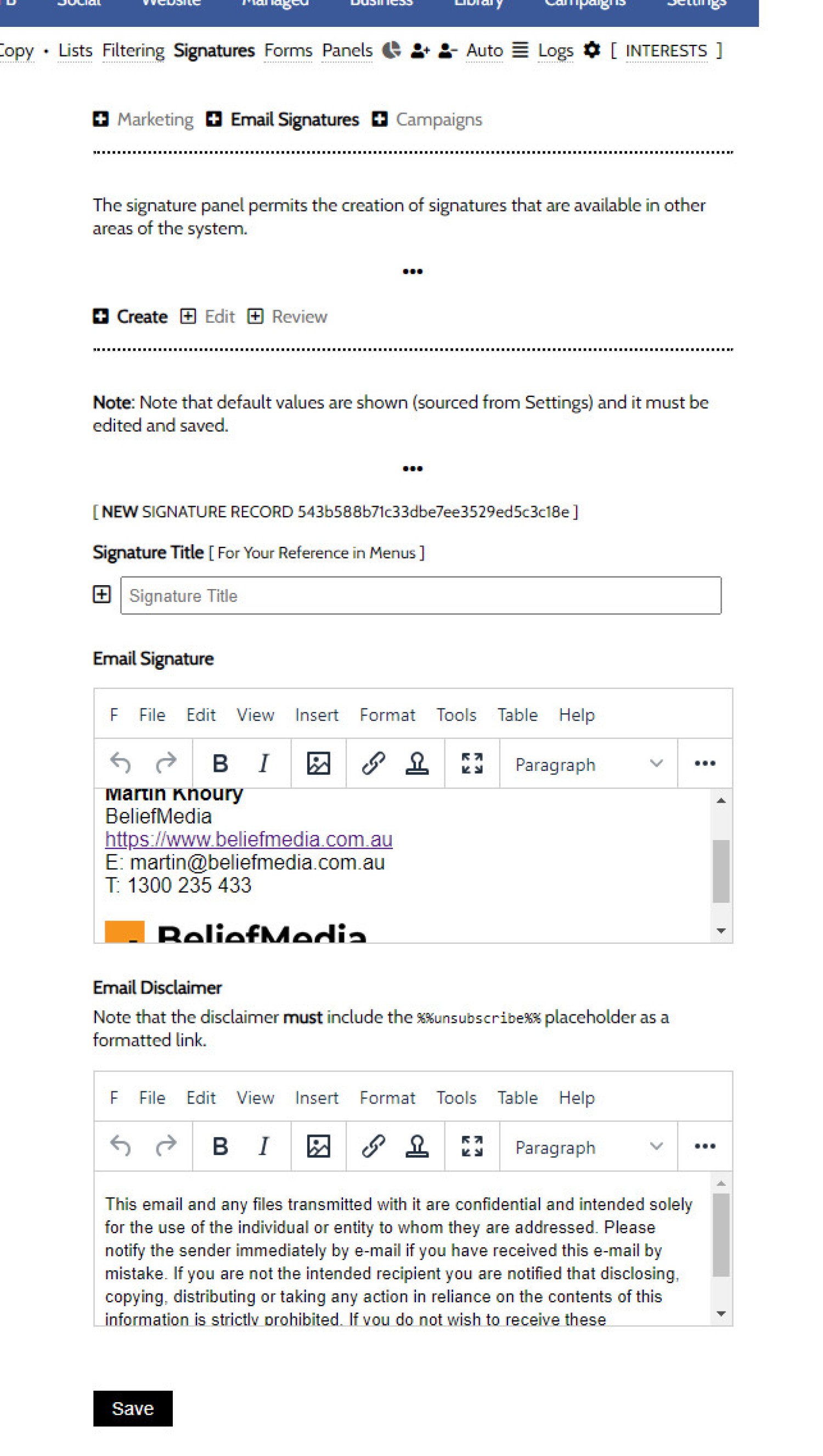 You will initially want to create two signatures. One signature will be created for standard campaigns that will includes an unsubscribe link, and another without the unsubscribe link - the latter is often used for once-off email, such as those originating from the Referrals module. The methods of including the unsubscribe link is detailed shortly.