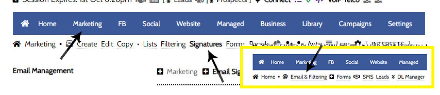You will locate the Email Signature panels by following the 'Email & Filtering' menu in the 'Marketing' module. Panels will be returned to Create, Edit, and Review each signature. The signature panel may also be found within the 'Email' module within the 'Settings' panel, and it is also accessed whenever the signature icon is shown ().