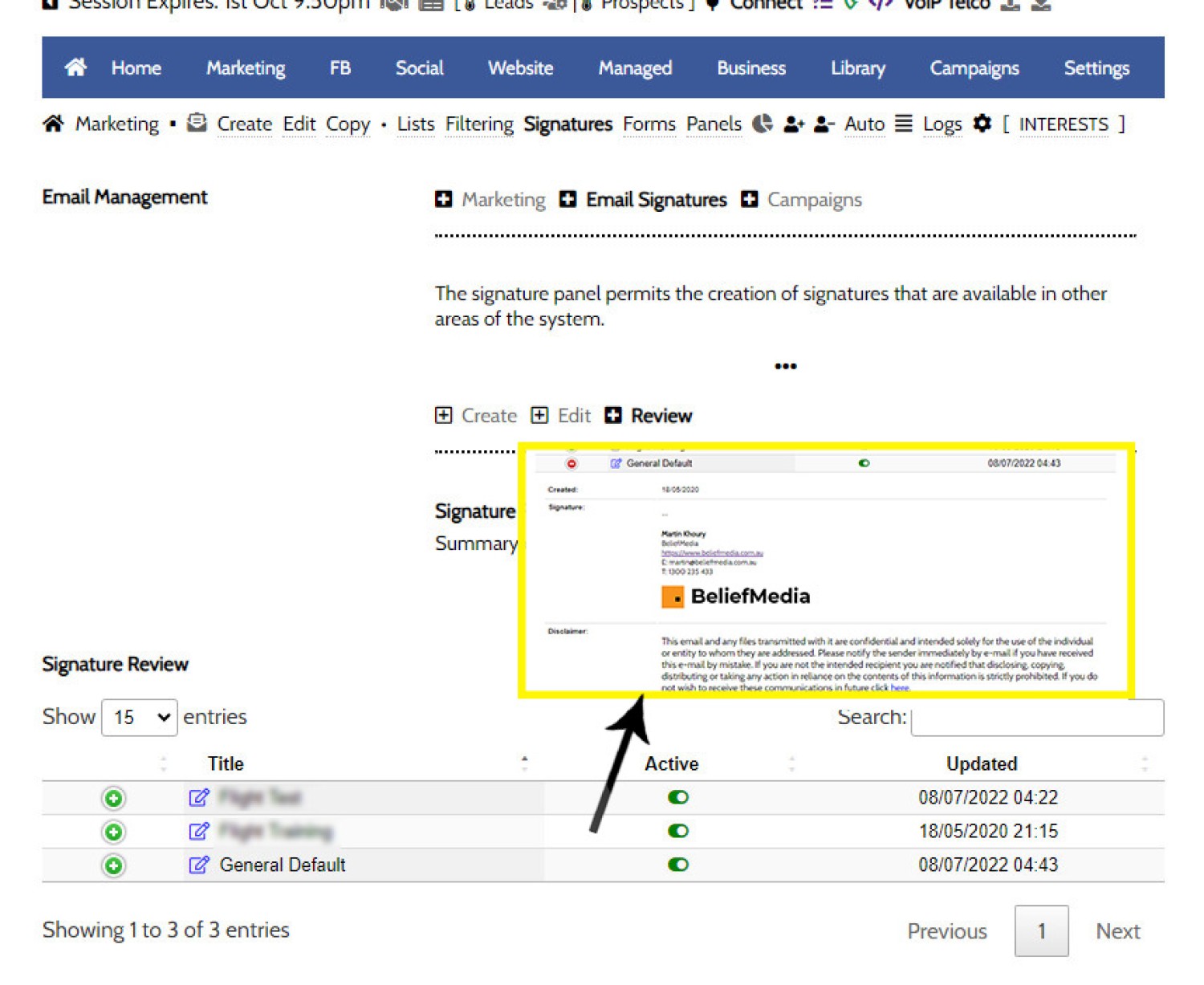 Pictured: You will locate the Email Signature panels by following the 'Signatures' menu in the 'Campaigns' module. Panels will be returned to Create, Edit, and Review each signature. The signature panel may also be found within the 'Email' module within the 'Settings' panel.