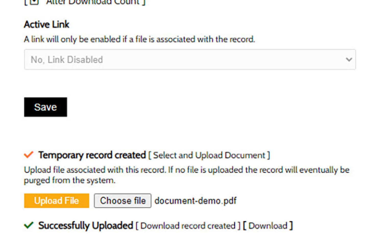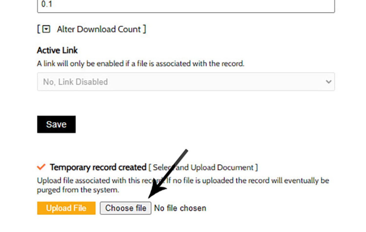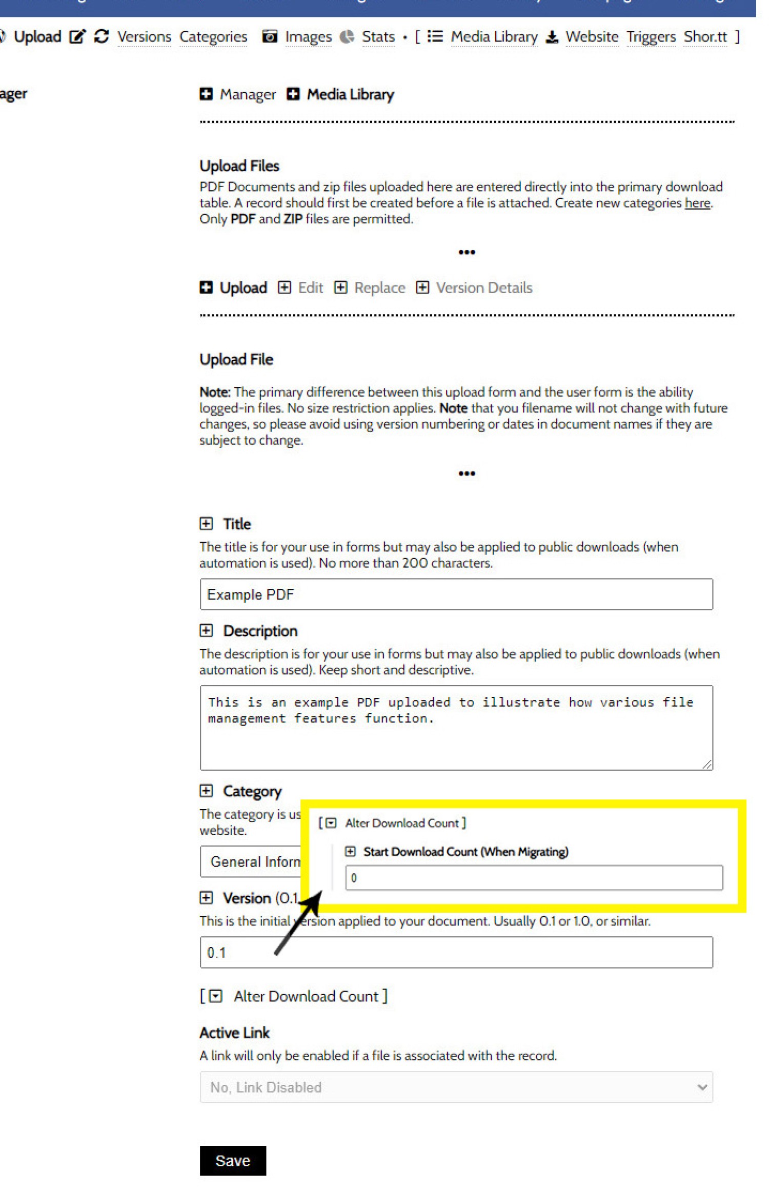 The first step is to create your download record via the 'Upload' panel. Populate the required fields. The method to create a Category is described shortly. If uploading a new file that already has a download history, you may update the 'Download Count' as required.