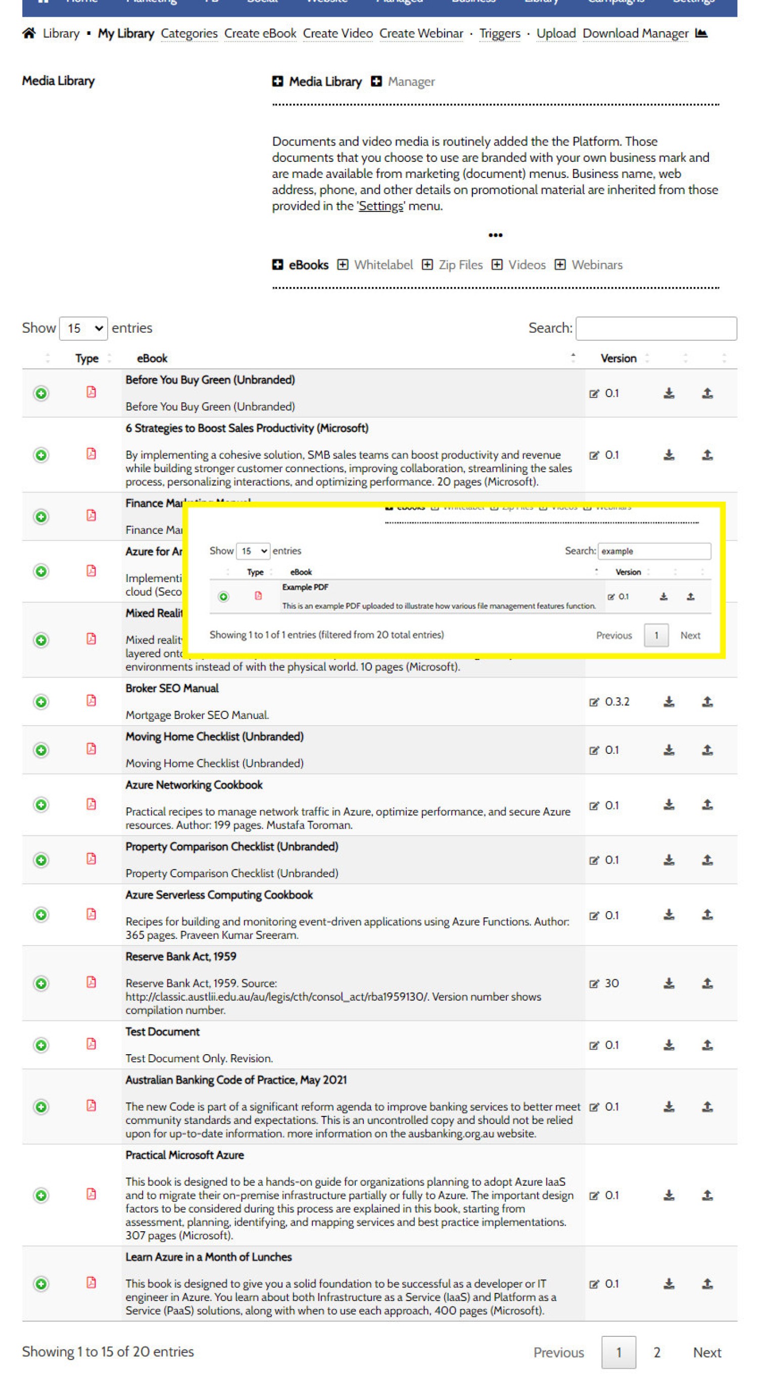 Your uploaded PDF and ZIP files are made available in your 'Media Library'. You may search for files if required. Selecting the green icon returns document data and returns a number of shortcodes that may be used on your website to link directly the file, show the version change log, link to the PDF Viewer, and embed directly into your website. All these tools are supported with Elementor drag-and-drop widgets. Additional FAQs reference how the tools are used.