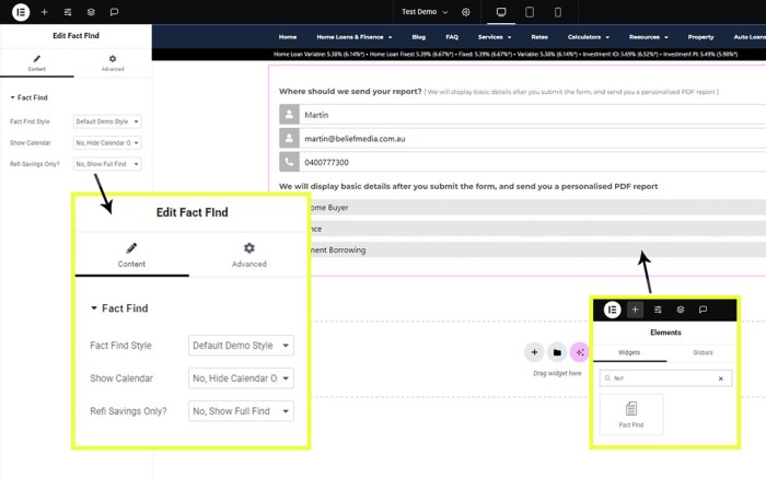 Pictured: You may place the form on any post or page with an Elementor widget or with shortcode. The Elementor is a drag-and-drop option so we'll look at it first. from Elementor, search for 'Fact Find', then drag that widget into any post or page. It takes just a few seconds.