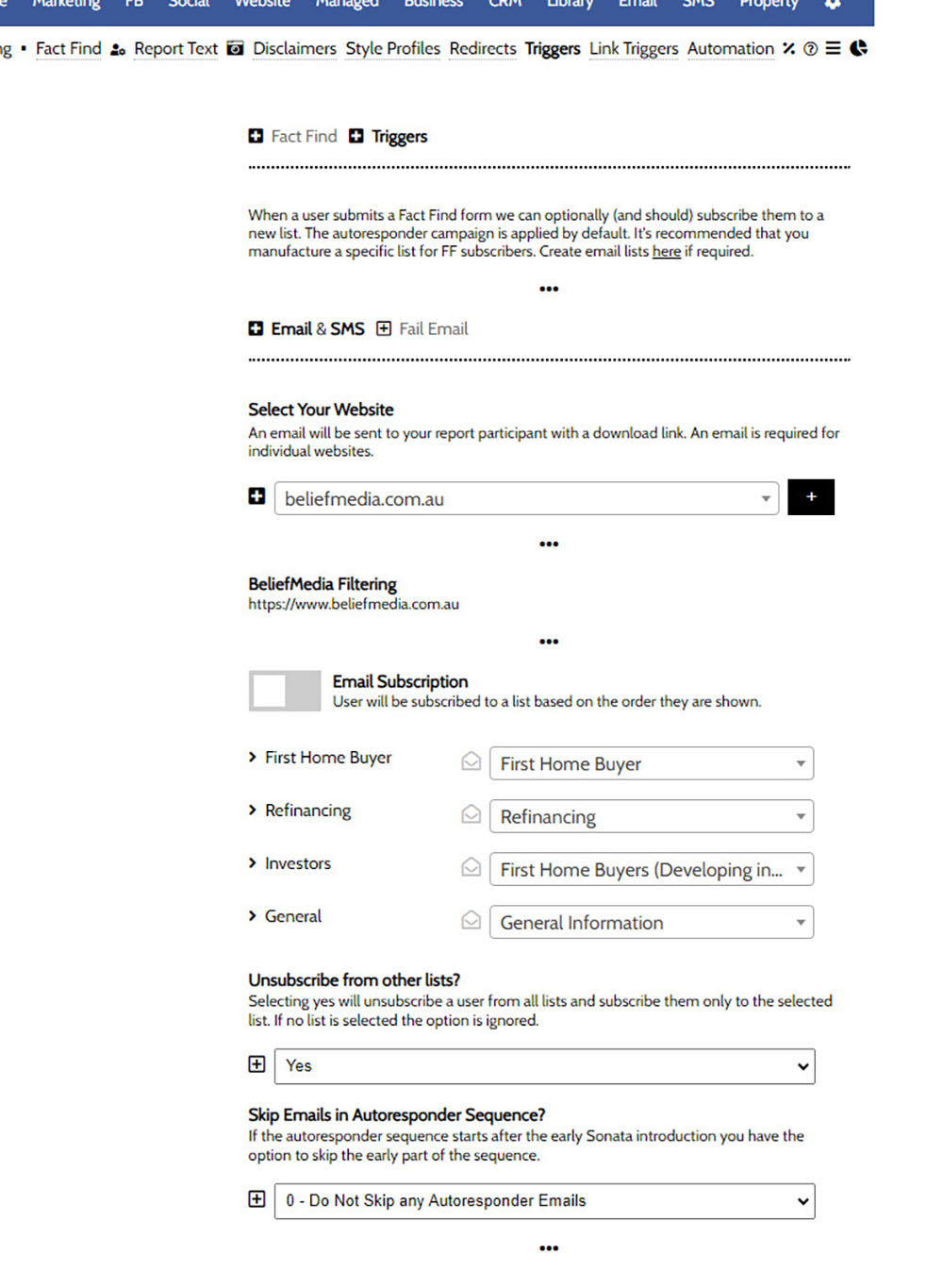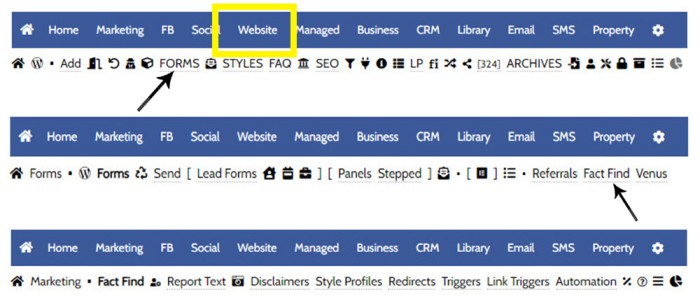 Pictured: To locate the Fact Find Report options in Yabber, first select the 'Website' module, then 'Forms' in the submenu, then 'Fact Find'. A large number of options are presented, many of which are required before the report will function.