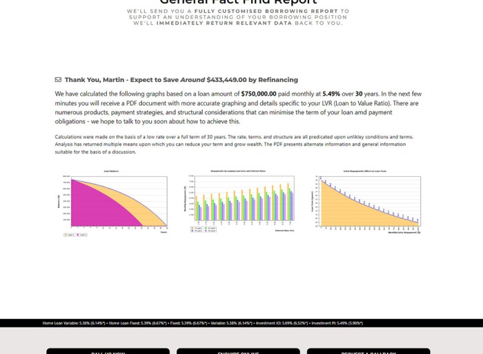 The personalised response is created as a PDF (including their name on the front cover) and sent to them via email. The contents is based around the resolved LVR/LMI information that may be applicable. It's important not to exclude or qualify on the basis of these reports - we want to get them on the phone.
