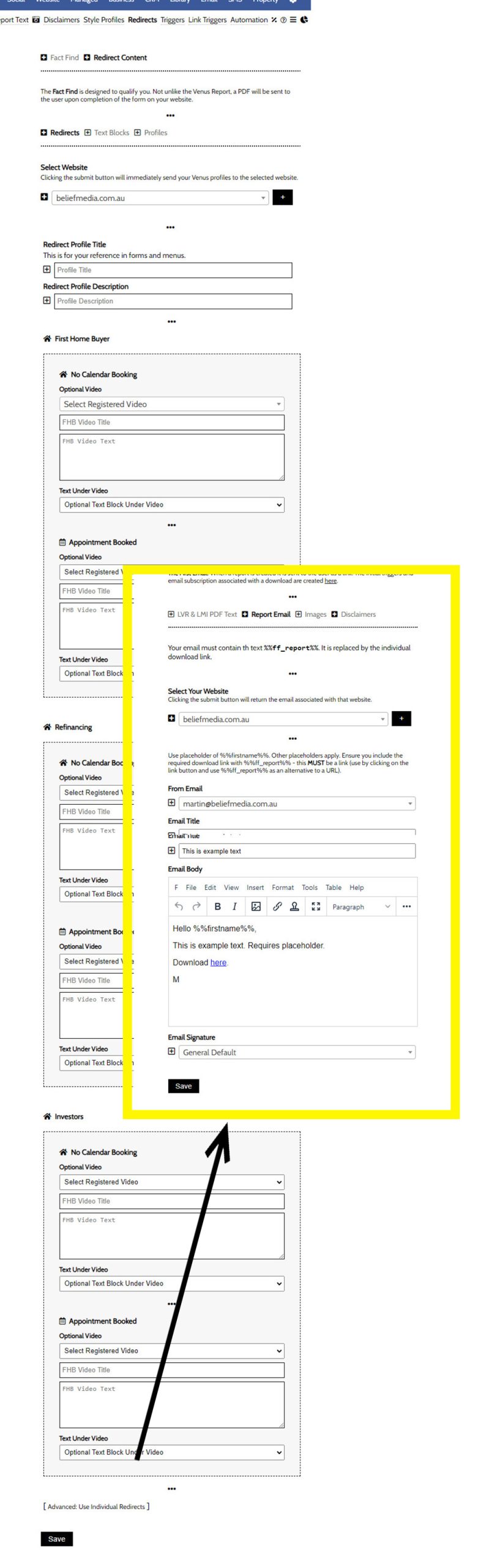 The text in the PDF document is defined by you, and responses are created for first home buyers, those refinancing, and investors, with content generated on the basis of LVR (thus introducing LMI considerations). Required text blocks in Yabber are as follows (click here
