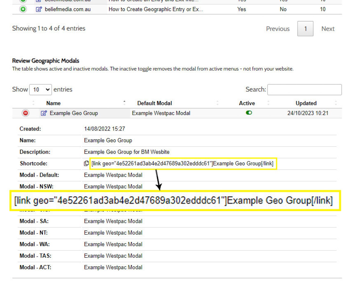 Pictured: The Geographic modal is obtained via the 'Review' panel as above. Open up the specific profile for review and copy the supplied shortcode.