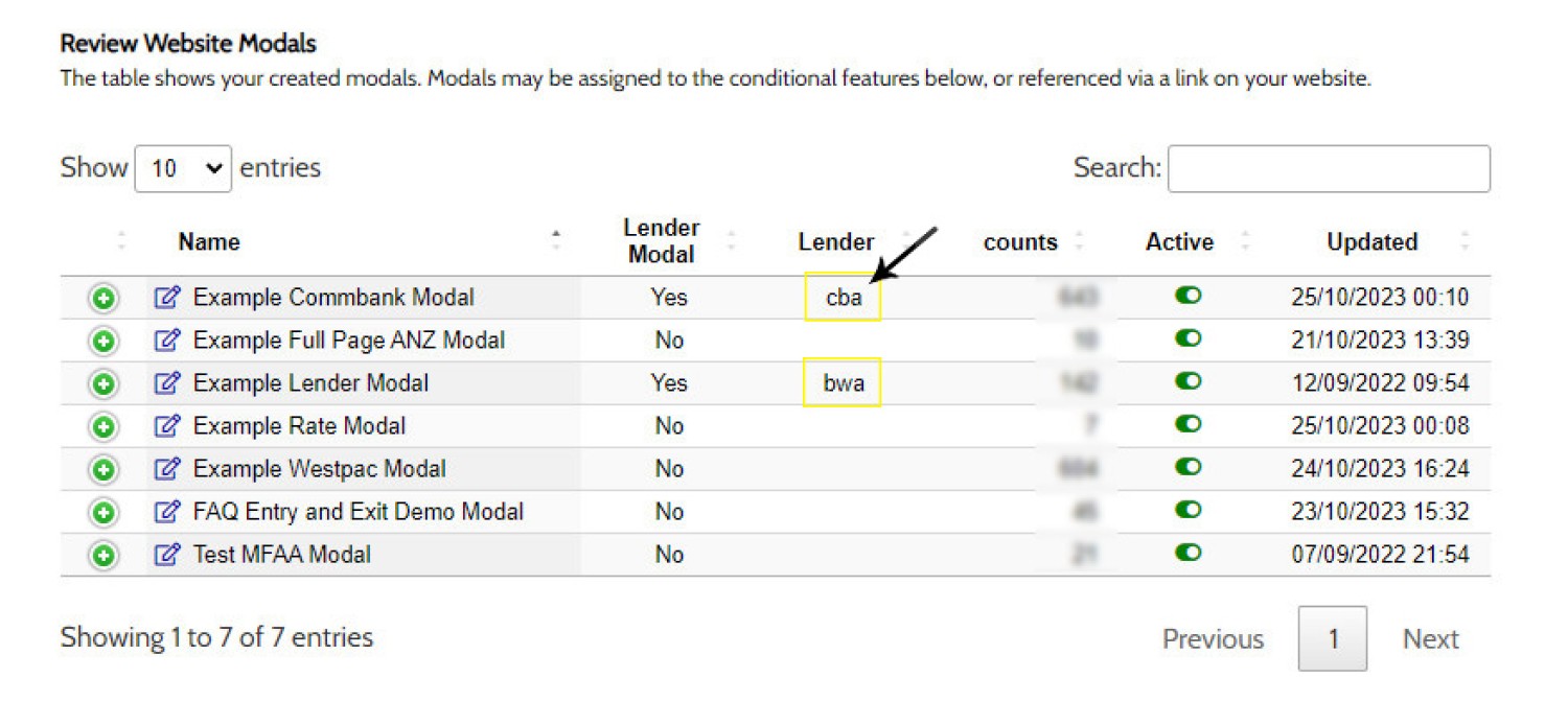 Pictured: Lender Modals are indicated as such in the primary Modal Review table. See below and take note of the 'Lender' column - this will show the modal that is paired to a specific lender.