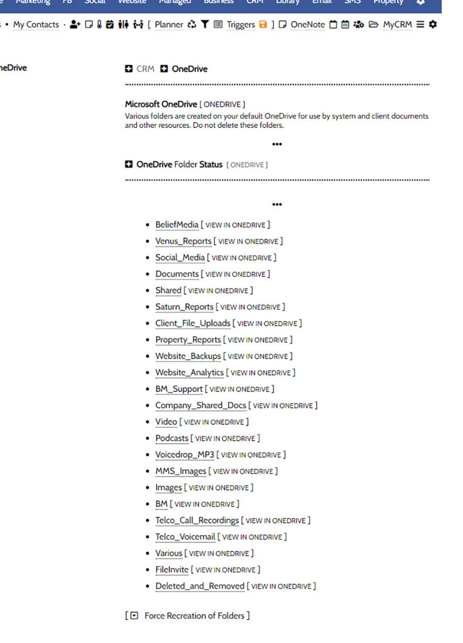 Content may be shared in both directions once the folders are created, but in most cases it's Yabber that will populate the folders for you. Client documents, voicemail recordings, social content, and other material will be shared to these folders if defined (usually within an appropriate sub-folder). Some folders, such as 'Voicedrop_MP3' is reserved for recordings you expect to import into Yabber's Voicemail module. Any module that requires OneDrive connectivity will make the reason known to you.