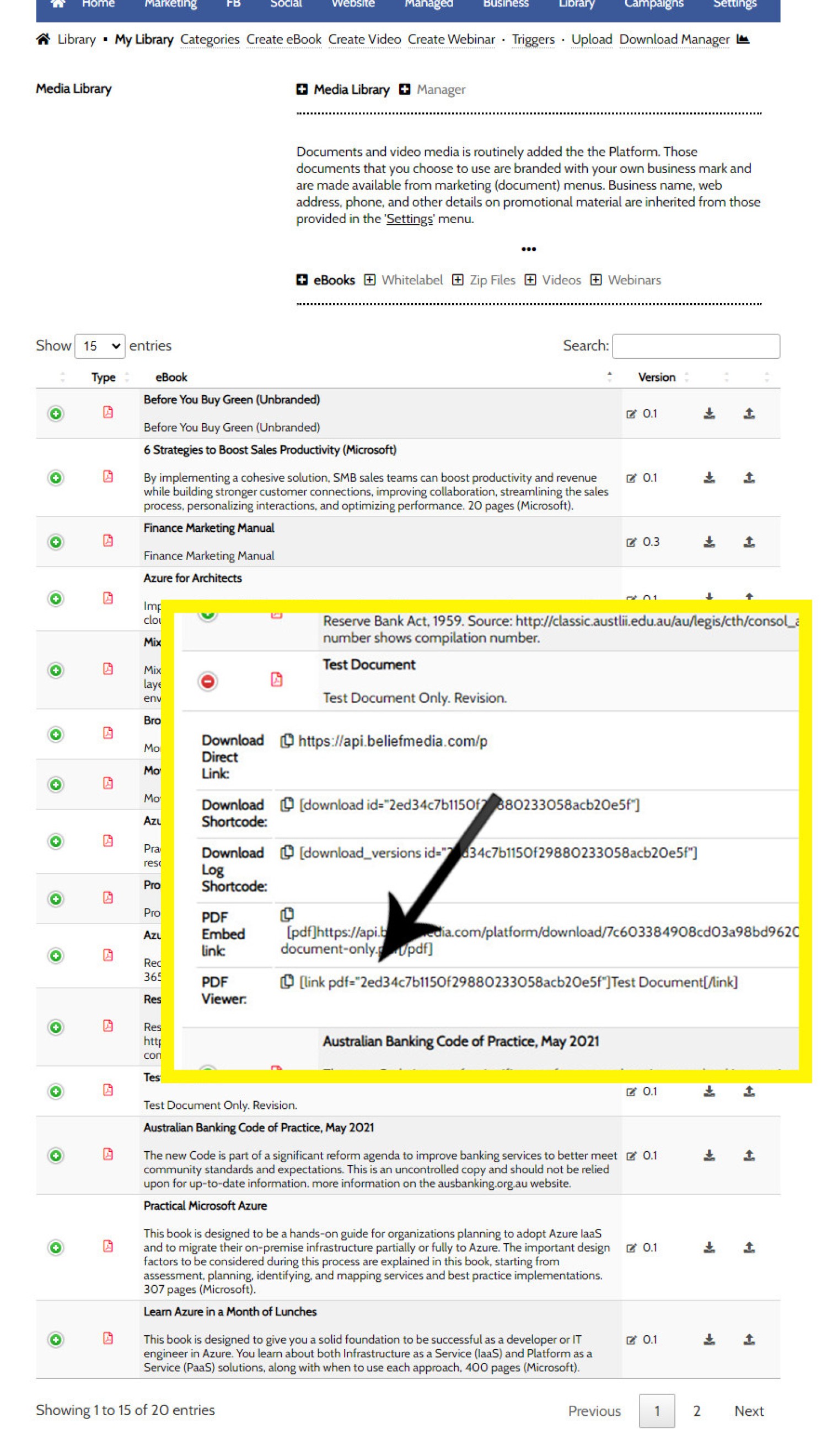 Pictured: Within the File manager, you should select your own or white-label ODF documents. Open the panel associated with a record via the green icon and various links will be returned. Select the PDF Viewer link and copy it to your website, although you'll need to change the anchor (or the text that becomes 'linked').