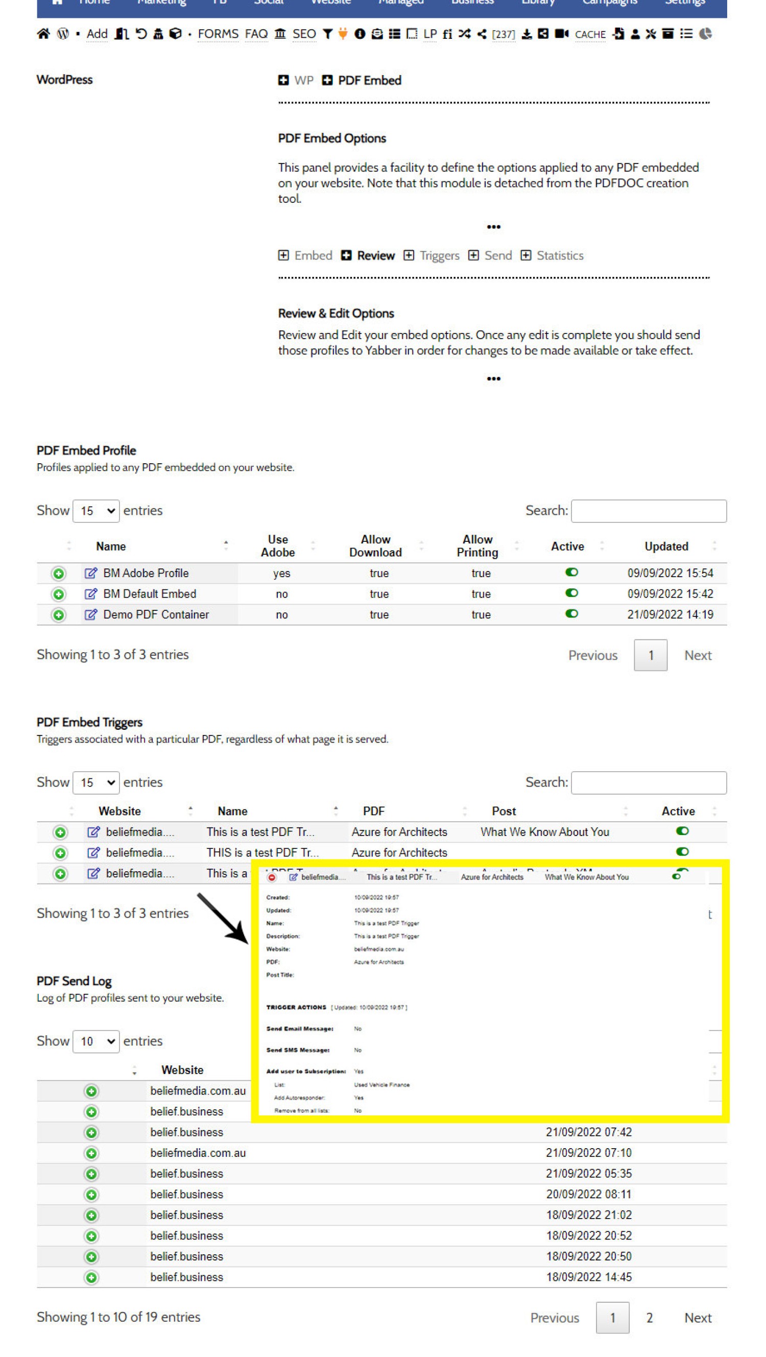 Pictured: You may review PDF Triggers from the 'Review' panel. While you may 'disable' triggers from this panel you will still be required to send the new data packet to your website (as above) in order for the changes to take effect.