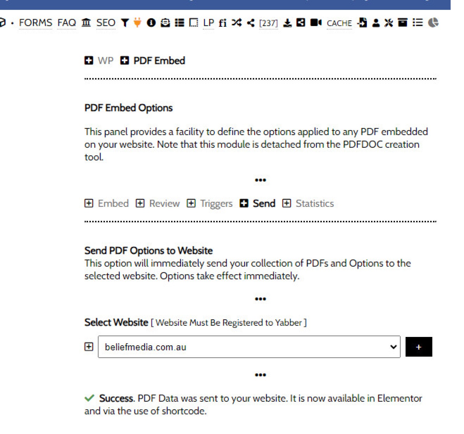 Pictured: Yabber is a multi-website system so we're often required to send our data to the applicable website. Via the 'Send' panel, select your website and submit. Triggers will apply immediately.