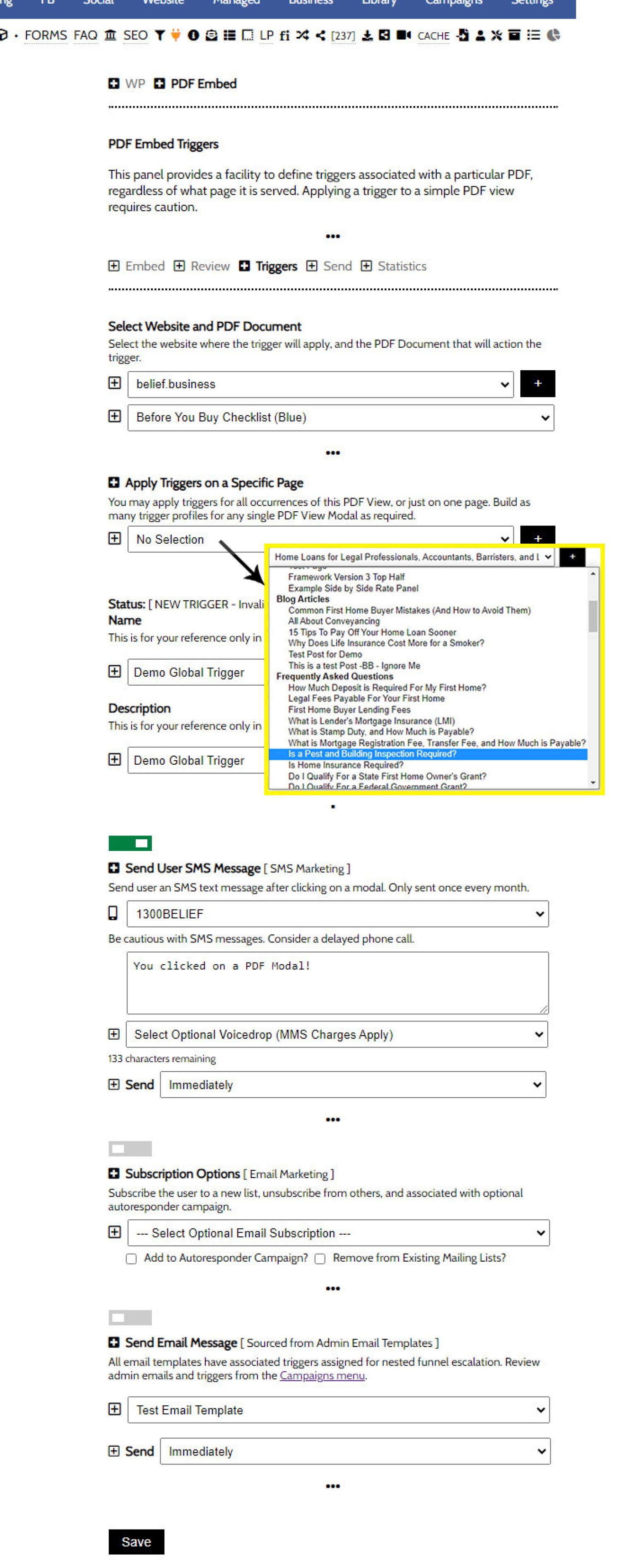 Pictured: You should first select your website. If the trigger will only apply on a specific page you should select that page (the default is to globally apply the trigger on all pages). Select an optional SMS message, email message, and email subscription (including the facility to unsubscribe from other lists and add to an email autoresponder program). Once defined, click 'Save'.