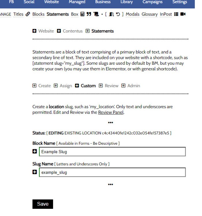 In the image shown above you will note two Statement Locations as 'Example Slug' and 'Example Slug 2' - these are Custom Locations. Custom locations are shortcodes assigned anywhere on your website, and they'll show dynamic text based on your selection. When or if you are required to update the text, this is effected quickly and easily in Yabber.