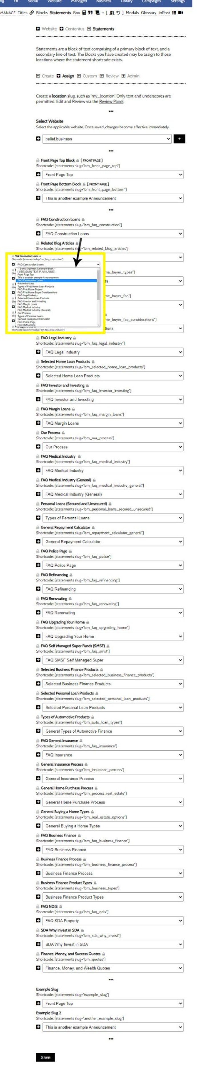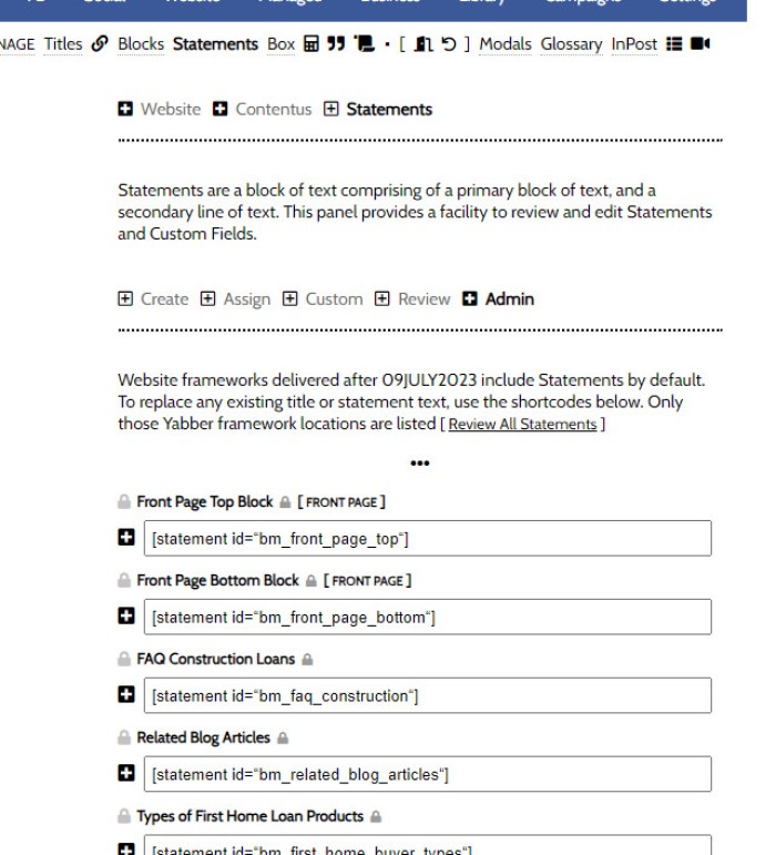Older frameworks do not include the Statement feature. Managed clients will have these updates applied immediately - others will not. To update yourself, find the Location shortcode in the 'Admin' panel. Copy these default Statement location blocks wherever you would like the Statement text to be shown.