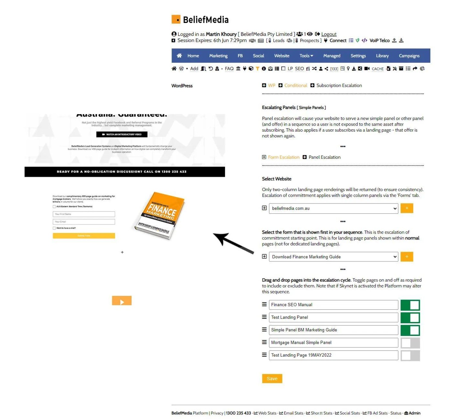 First, and as pictured, we don't want to show a user the form again after they've subscribed - regardless of the page they subscribed from, including a landing page - so we set up vertical escalation profile. From within Yabber, we drag and drop forms and panels into the order we would like them shown on our website for any specific form. Remember, a marketing funnel (unlike the typical subscription nonsense peddled to the market) is about "what comes next", and we have to actively shape the user experience so we don't drag a user around in circles (a journey implies a changing landscape). The vertical form escalation supports the broader 'escalation of commitment' necessary to drive conversions.