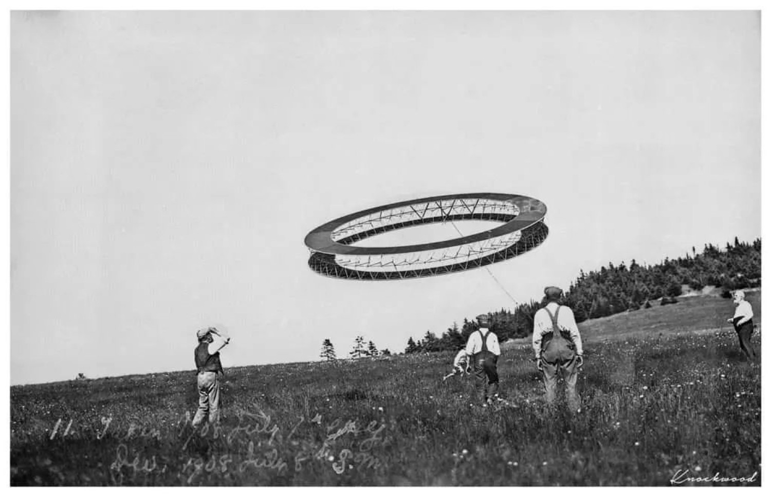 Alexander Graham Bell (right) and his assistants flying a circular tetrahedral kite, 1908.