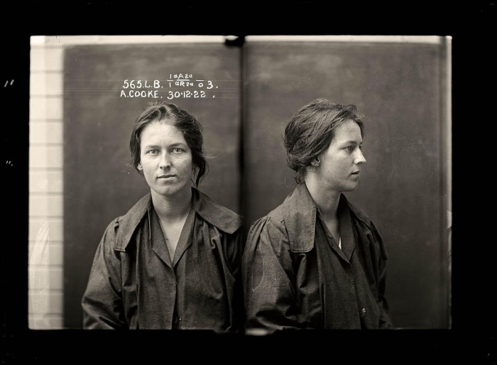 Convicted of bigamy and theft. By the age of 24 Alice Cooke had amassed an impressive number of aliases and at least two husbands. Described by police as 'rather good looking', Cooke was a habitual thief and a convicted bigamist. Aged 24.Part of an archive of forensic photography created by the NSW Police between 1912 and 1964.