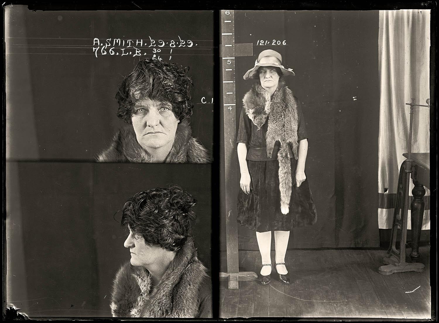 Alma Smith worked as an illegal abortionist in the northern NSW town of Tamworth. A young woman, who later died as the result of a botched abortion, identified Smith as the abortionist. Smith denied knowing the woman but was convicted andsentenced to five years gaol. Aged 34. Part of an archive of forensic photography created by the NSW Police between 1912 and 1964.