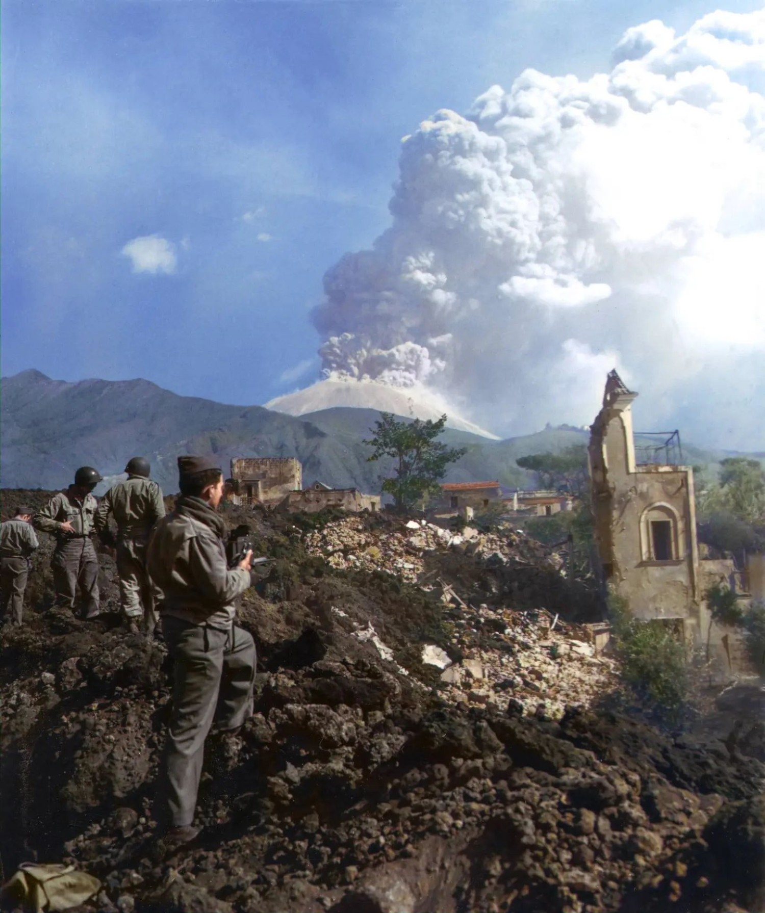 American GIs watch smoke billow from Mt. Vesuvius, Italy, 24 March 1944.