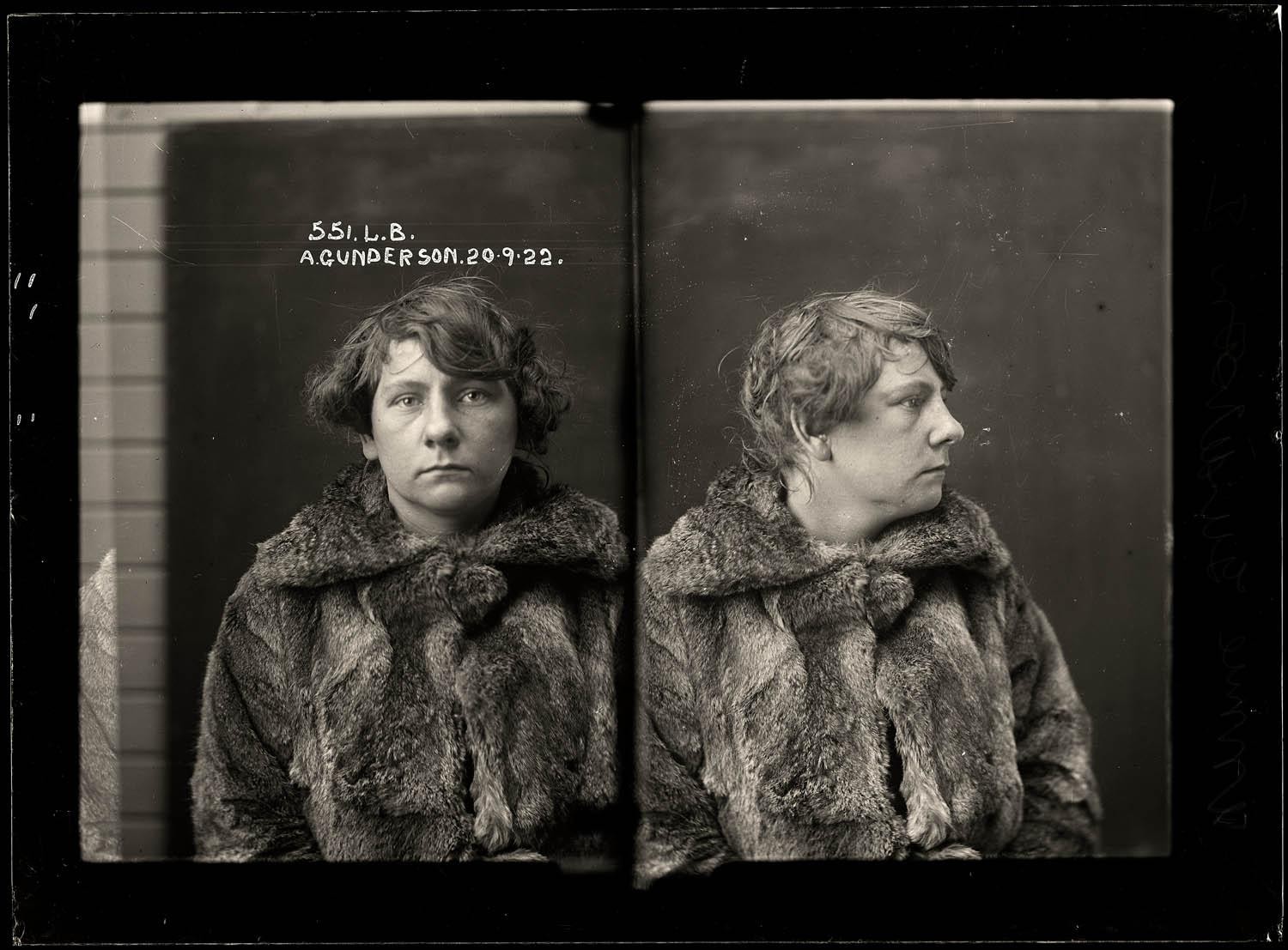 Charged with stealing a fur coat. Teenager Annie Gunderson was charged with stealing a fur coat from a Sydney department store called Winn's Limited, in 1922. Police records do not indicate whether the fur she is wearing is the stolen item.Aged 19. Part of an archive of forensic photography created by the NSW Police between 1912 and 1964.